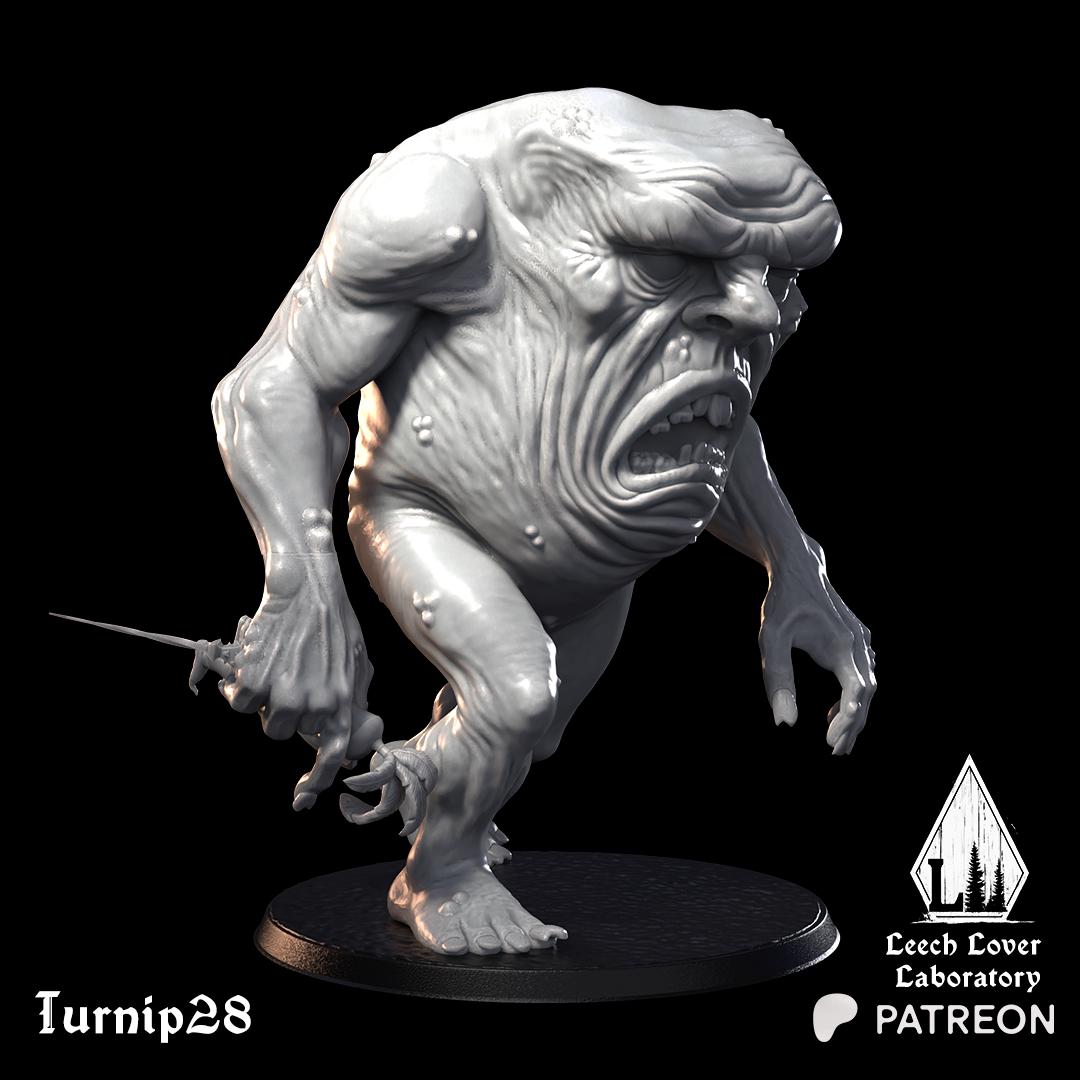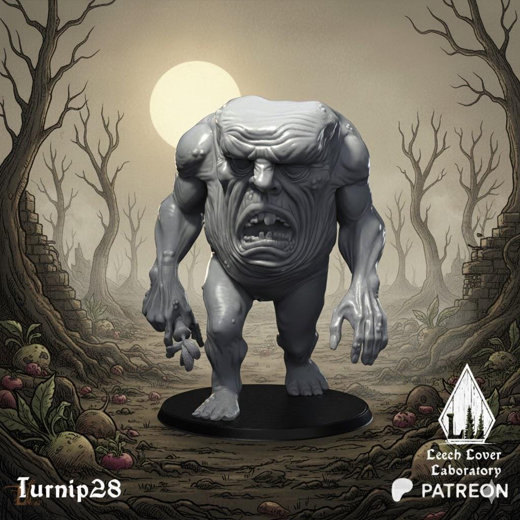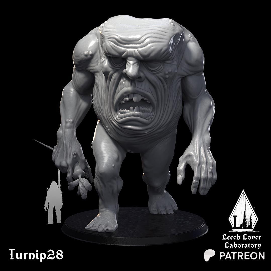 A monstrous giant, his face leering from his chest. This is a perfect proxy for large monsters in a land infested with turnips or sludge, or as a chaotic giant in Age of Fantasy-style games.
