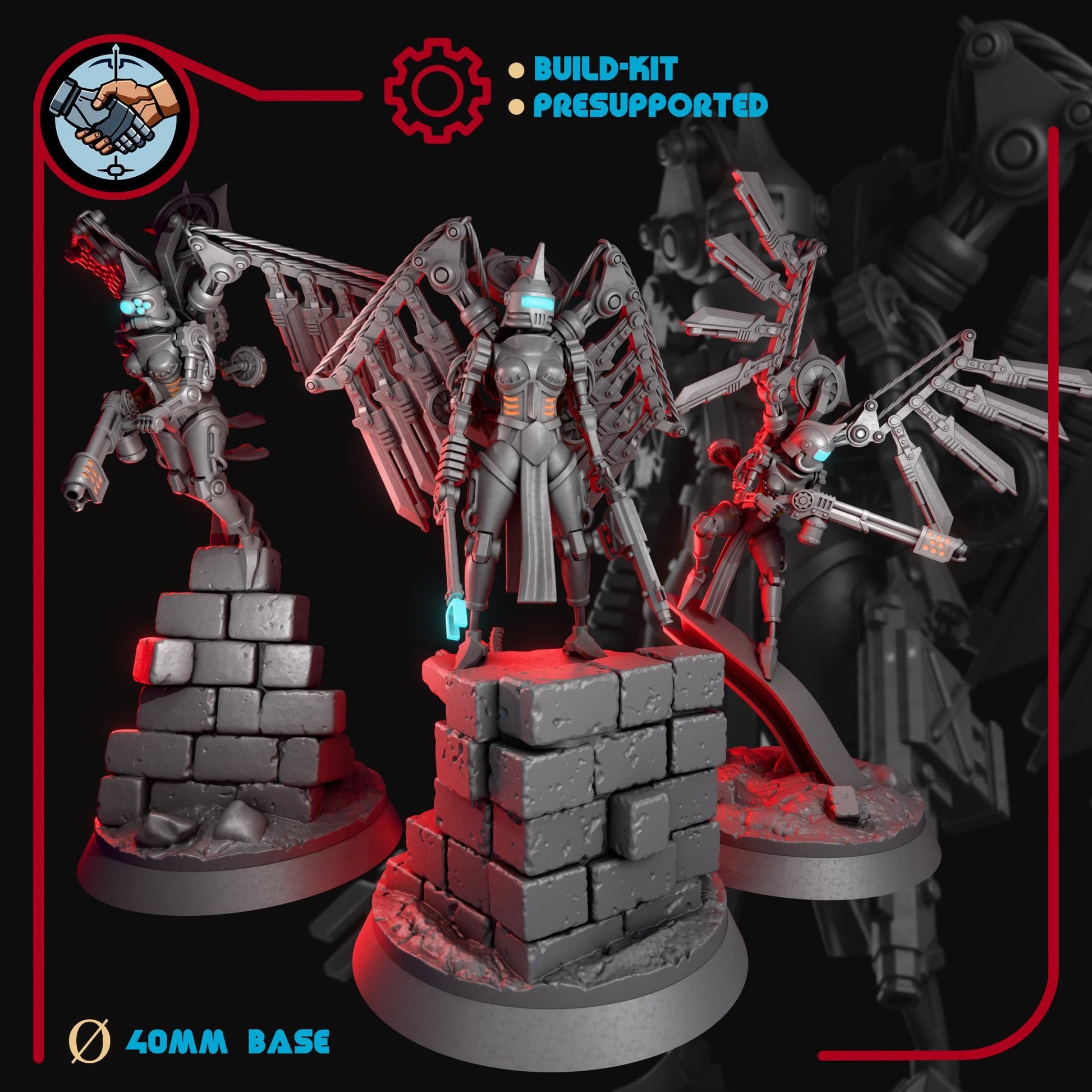 A five-man squad of skyraptors, who glides over the red planet's mesas on mechanical wings, like Icarus of old. Carrying powerful, military-grade sterilizer flamethrowers, these woman swoop down from the heavens only to burn away the Tech Cult's foes to dust. They are a good fit for futuristic mechanical armies, allowing you to introduce some variety to more common kits. This is a perfect addition for scifi wargames such as Grimdark Future, FireFight, or even Heretic Civil War.