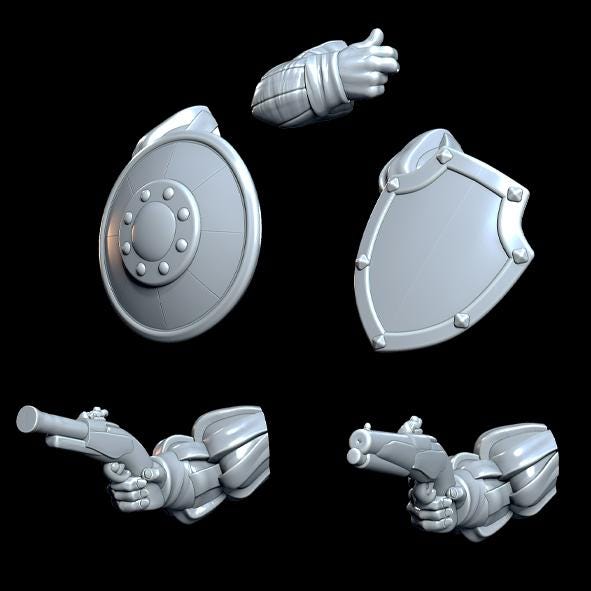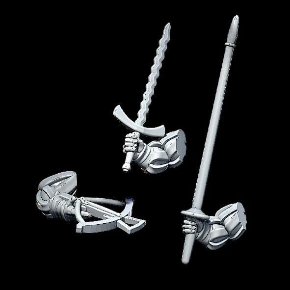 Soldiers can be built with a variety of weapons, including pistols, halberds, shields spears and bows. Torso is also available with a female variant. By default, you will receive 10 male soldiers with a loadout similar to the first image, with a variety of heads. You can refer to this listing for other options for weaponry and heads: https://www.etsy.com/listing/4295691004/multipart-human-imperial-state-troops