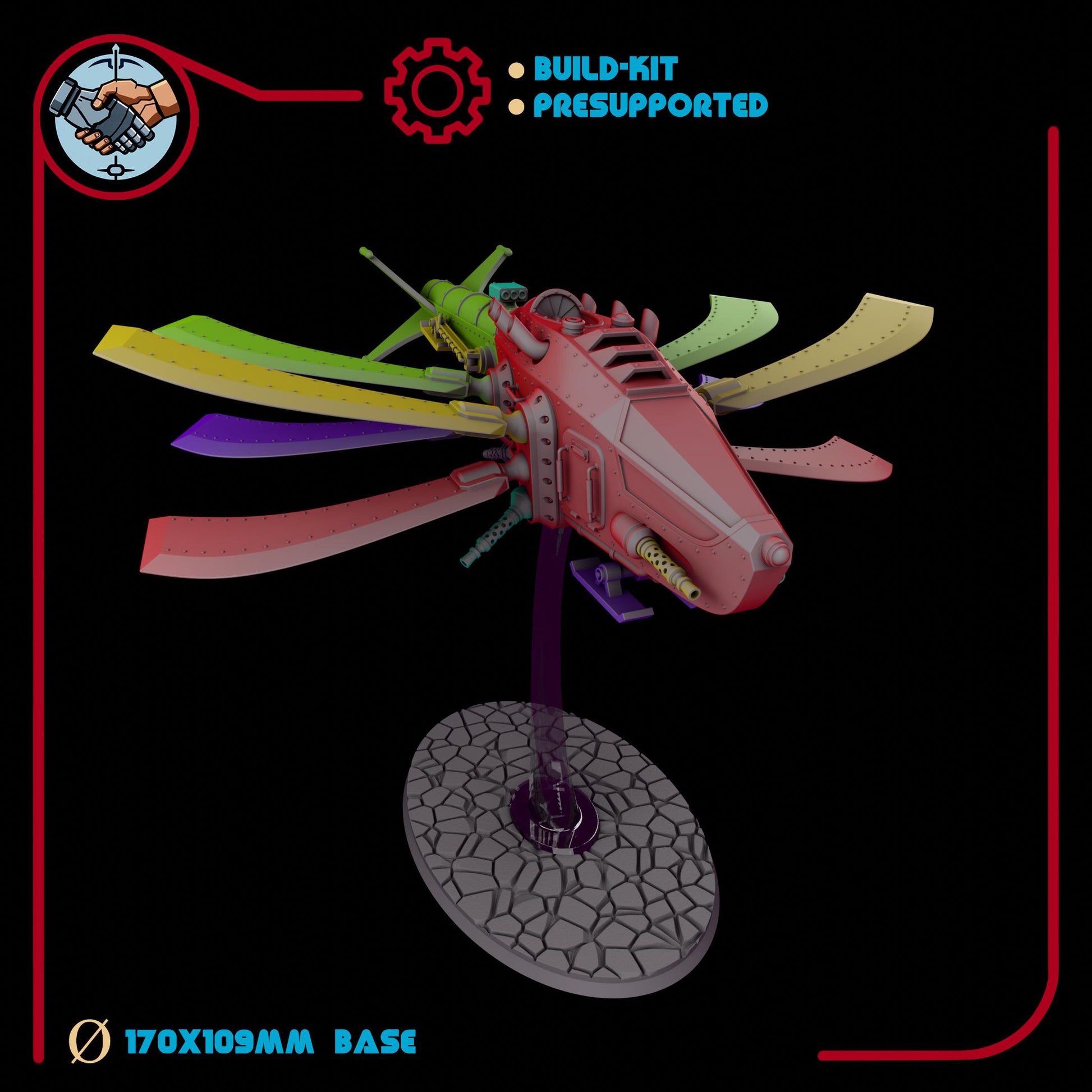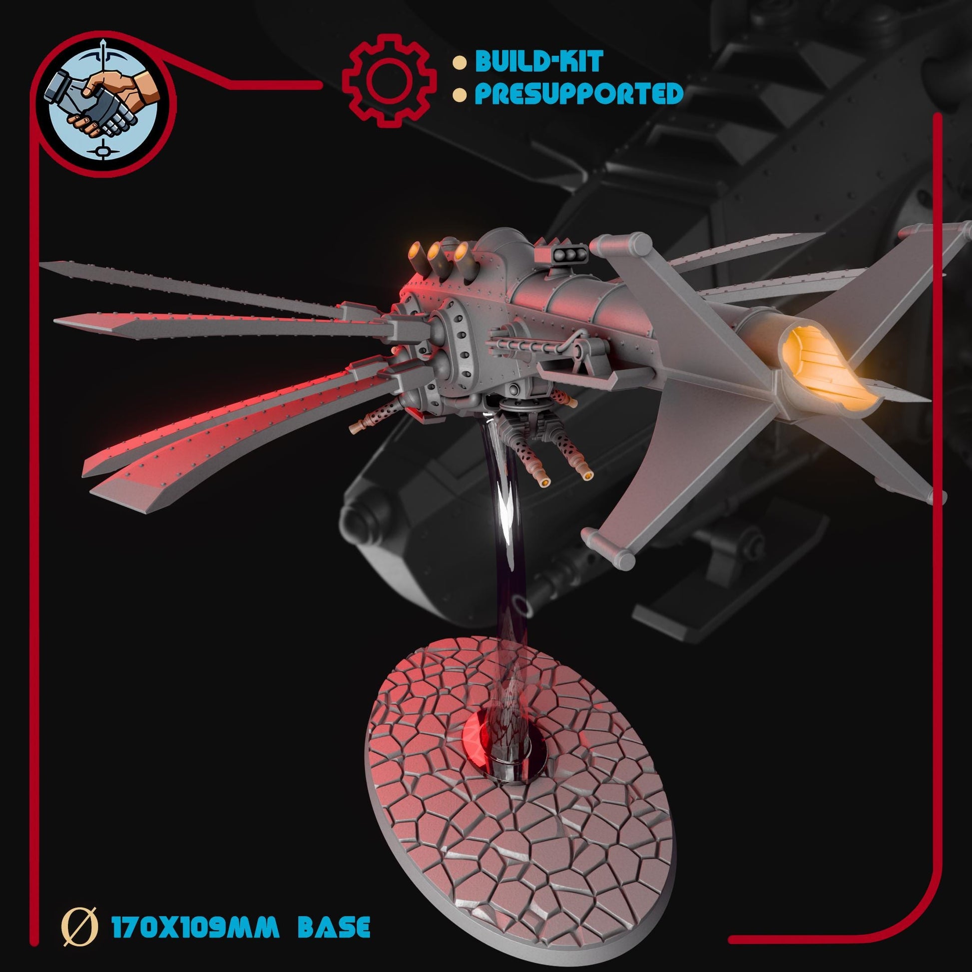 The reliable workhorse of the Tech Cult, the 'Chinook' class ornithopter is a mechanical marvel that can often be seen fluttering over the cracked red earth of Mars, maintaining an aerial presence over the foundries and factories below the crust. It is an agile craft armed with heavy machine guns as a primary weapon, along with a secondary single-shot array of rockets in reserve. This is a perfect addition for bolstering your Tech Cult's air support in scifi wargames such as Grimdark Future, FireFight, or even Heretic Civil War.