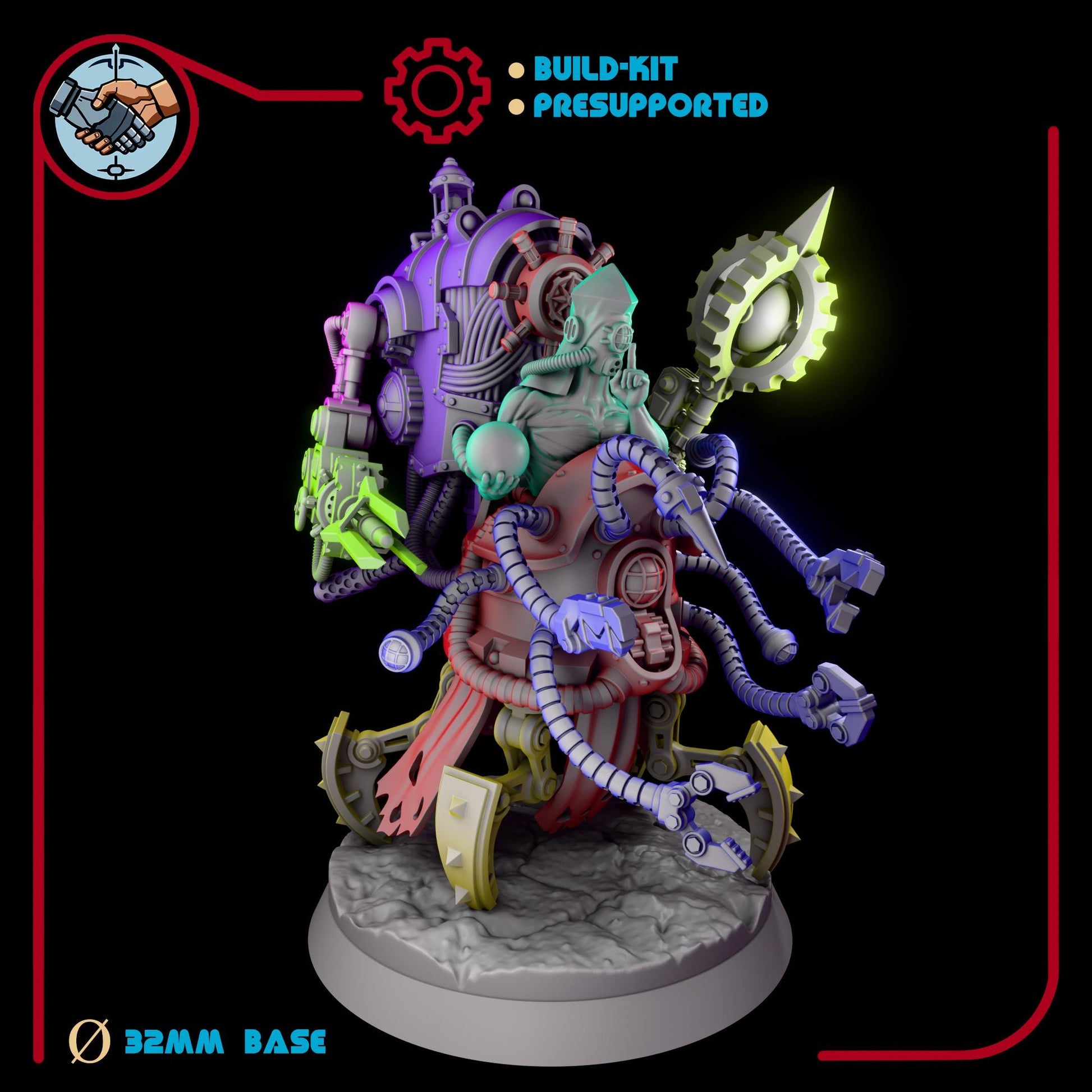 Skittering across the red dunes of Mars, their body slithering with dendrites and cables, the Tech Manipulator is a powerful cult leader of the Machine Cult who channels the very power of the Omnigod of Machines to empower the artifice of Mars in battle. They carry a crackling staff as a symbol of their office, and also have a secondary ranged weapon operated from their exoskeleton harness. This is a great fit for commanding futuristic mechanical armies, allowing you to introduce a unique hero to your collection. This is a perfect addition for scifi wargames such as Grimdark Future, FireFight, or even Heretic Civil War.