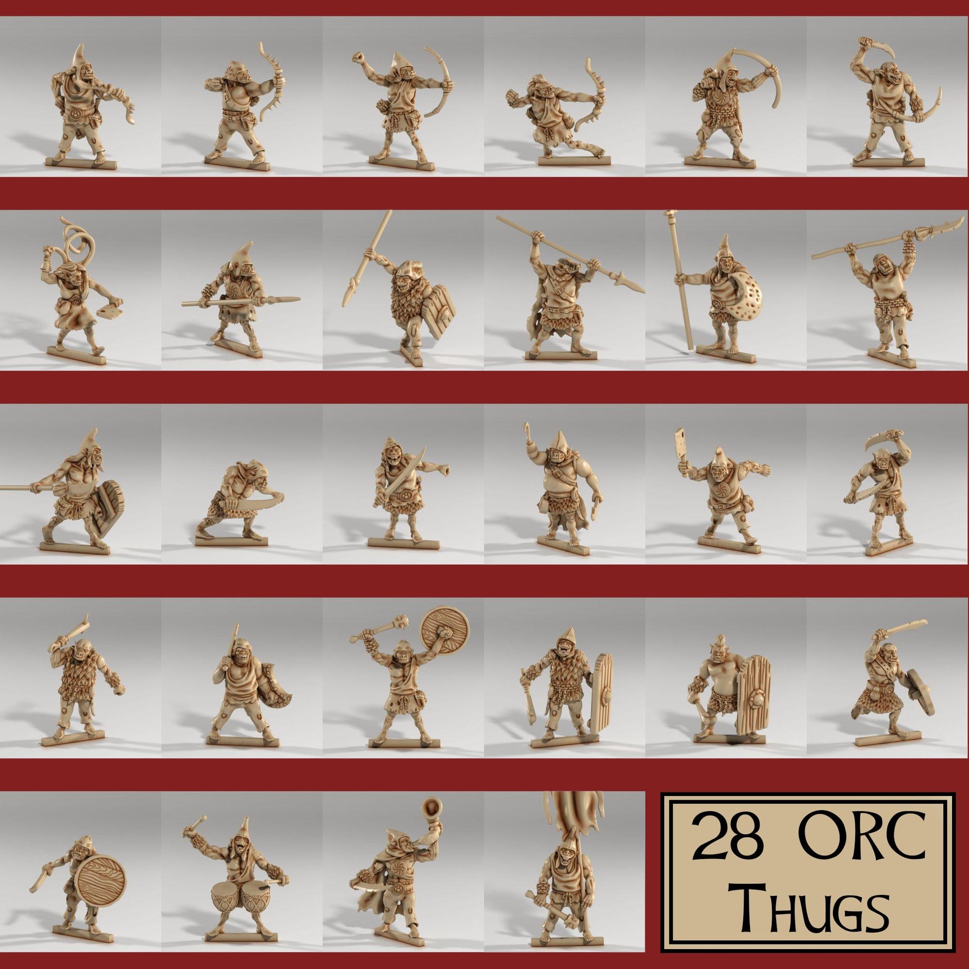 An army of savage, undisciplined orc brutes, armed with everything from spears to swords and shields to bows, perfect for use in many popular Fantasy Battle systems, from rank and flank to cursed city skirmishers, or as dungeon enemies in a TTRPG. These models are monopose.