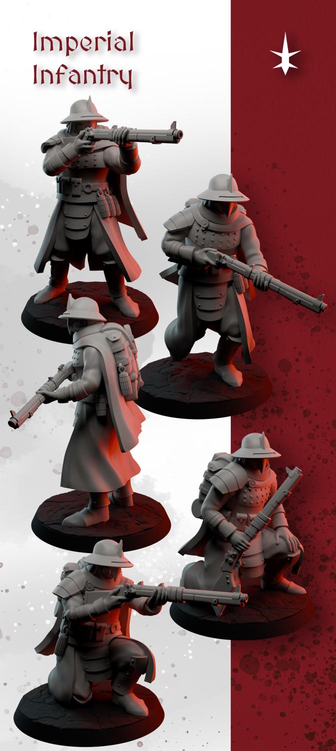 The Imperial Riflemen are the common foot-soldier of the Yorok army, formed up of conscripts mobilized to defend the interests of the nascent empire in the fires of the Great War. These make perfect proxies for both the Yeomen of Antioch and the Azebs of the Sultanate, or even as allies of the Heretic Legion in Trench Weird War-style games, or as a planetary defense unit in the Grimdark Future.